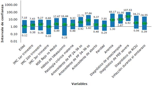 Los factores de riesgo asociados a parto muy pretérmino fueron haber sido diagnosticada con preeclampsia severa durante la gestación, con un RR=26.27 (IC95%: 6.92-107.53, p=0.000); haber sido diagnosticada con preeclampsia (severa y no severa), con un RR=12.09 (IC95%: 2.87-51.00, p=0.000); presentar anemia durante la gestación, con un RR=9.40 (IC95%: 1.30-68.17, p=0.005), y tener antecedente de PP, con un RR=7.82 (IC95%: 1.62-37.86, p=0.002) (Figura 2).