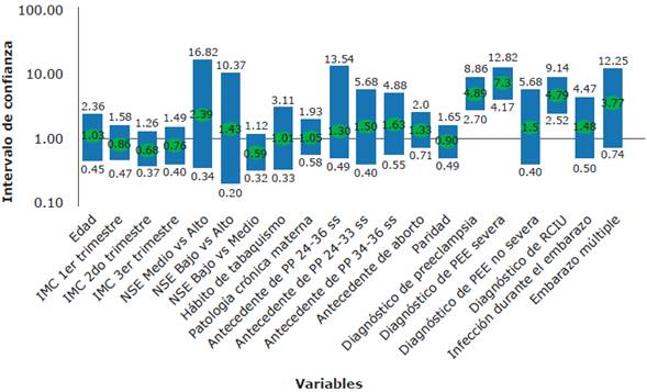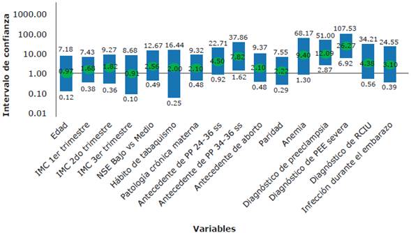 Las variables que se tuvieron en cuenta para determinar los factores de riesgo fueron las siguientes: edad, índice de masa corporal (IMC) en los tres trimestres, raza, nivel socioeconómico, consumo de sustancias psicoactivas, paridad, diagnóstico de preeclampsia (severa y no severa), restricción del crecimiento intrauterino (RCIU), infecciones durante la gestación, embarazo único o múltiple, y antecedente de hábito tabáquico, anemia, enfermedades crónicas maternas, PP o aborto.