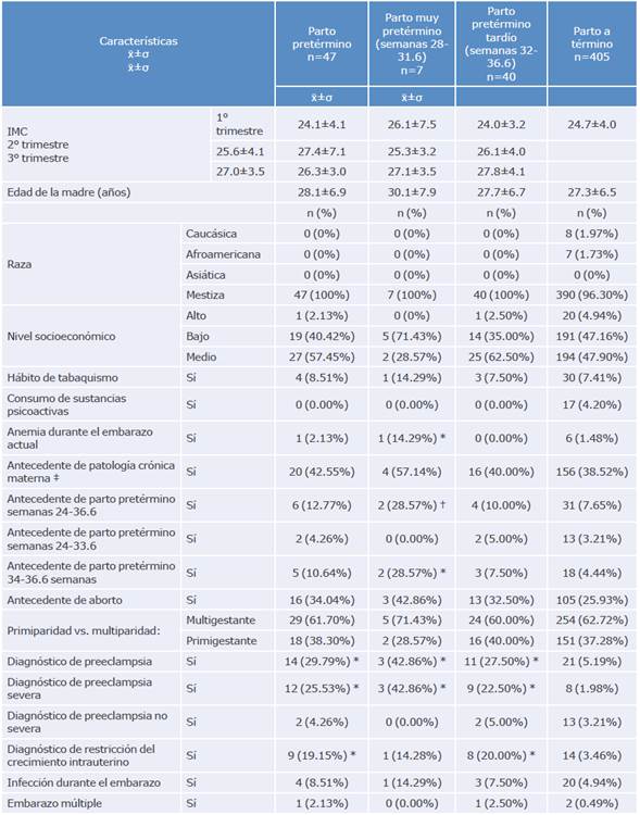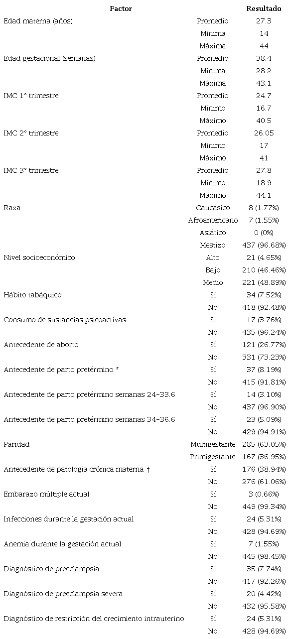 Ninguno de los PP se presentó entre las semanas 22 y 27.6 de gestación; 7 (1.55%; IC95%: 0.40-7.70) fueron entre las semanas 28 y 31.6, y 40 (8.85%; IC95%: 6.20-11.50), entre las semanas 32 y 36.6. Las características generales de la muestra se presentan en la Tabla 1.