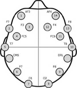La actividad cerebral se registró con el dispositivo Emotiv Epoc® que tiene una frecuencia de muestreo de 128 Hz. Cada EEG registró 14 canales a través de electrodos posicionados según el sistema 10/20 (Figura 1) usando como referencia los electrodos ubicados en el hueso mastoides. Los datos obtenidos se procesaron con el algoritmo automático ADJUST del programa EEGLAB en la plataforma MATLAB 2008. Se utilizaron los registros de los lóbulos frontal (AF3 y AF4), temporal (T7 y T8) y occipital (O1 y O2), y se analizó el rango de frecuencia 13-30 Hz (onda beta) debido a que la actividad cerebral que subyace a la resolución de tareas cognitivas ocurre en este rango.