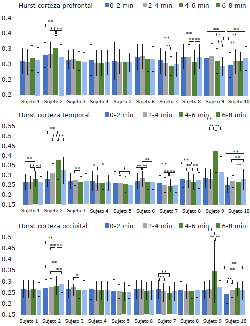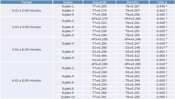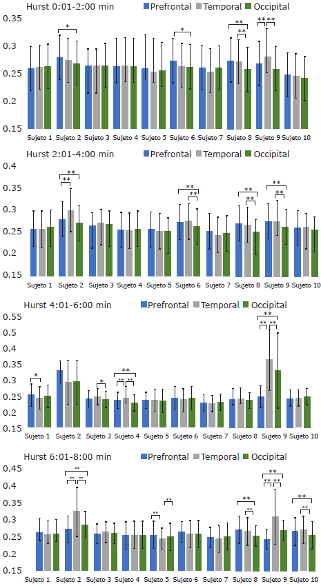 La Tabla 1 muestra los resultados de las pruebas t-Student para muestras independientes que evidenciaron diferencias significativas inter e intra-hemisfericas en los valores medios del exponente H en las regiones prefrontales, temporales y occipitales (p<0.05). Las comparaciones se realizaron cada dos minutos (Figura 2); en el primer período de tiempo (0:01 a 2:00 minutos) solo se observaron asimetrías en la región temporal de tres sujetos, mientras que en el período final (6:01 a 8:00 minutos) las asimetrías se presentaron en seis sujetos y se dieron en las tres regiones.