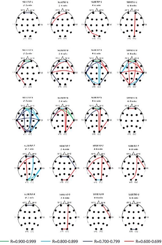 La Figura 4 presenta las correlaciones entre los índices del exponente H consideradas como altos (r<0.600); allí se evidencia que los sujetos 1, 2, 6 y 9 presentaron pocas correlaciones significativas en los cuatro períodos, mientras que los demás sí presentaron relaciones con algunos cambios en las intensidades entre las regiones.