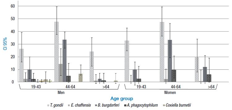 The frequency of seropositivity was statistically higher as the age group increased: 0.7% in individuals under 30 years of age and 40% in older adults. The frequency of T. gondii (47.3%), B. burgdorferi (33.3%), A. phagocytophilum (9.52%), E. chaffensis (2.3%) andL. interrogans (2.3%) was statistically higher in women over 50; the frequency of C. burnetii (2.3%) and F. tularensis (2.3%) was statistically lower in young adults. On the other hand, the seropositivity of T. gondii (47.5%), B. burgdorferi (33.5%), E. chaffensis (14.3), C. burnetii (6.64%), F. tularensis (6%), A. phagocytophilum (4.89%) andL. interrogans (1.4%) was statistically higher in men between 45 and 50 years of age (Figure 1).