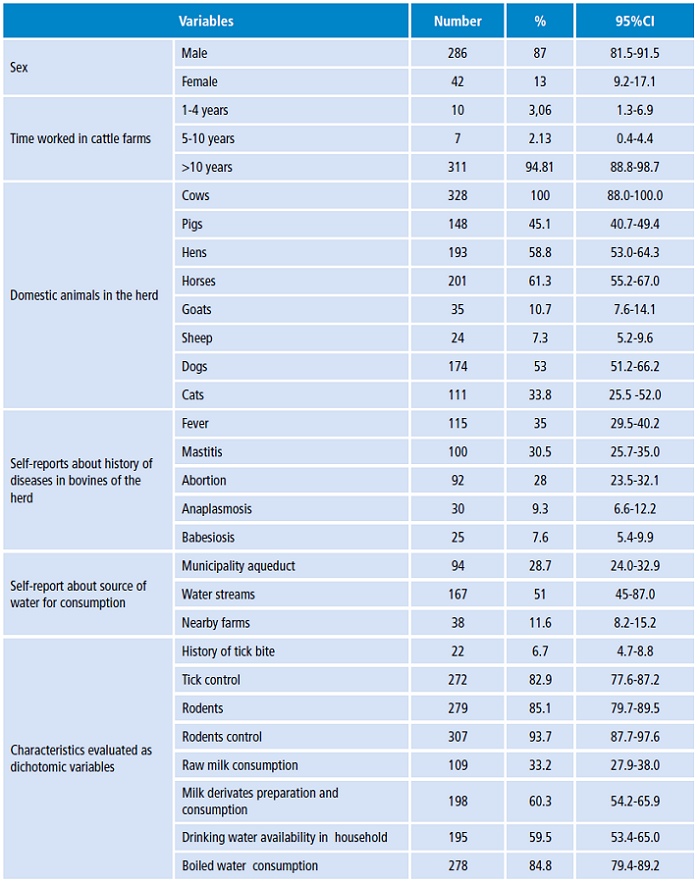 Materials and methods: Descriptive study carried out on a population of 328 cattle farmers. Demographic data were collected and the seropositivity frequency of IgG antibodies to Babesia bovis, Babesia bigemina, Anaplasma phagocytophilum, Ehrlichia chaffensis, Borrelia burgdorferi, Coxiella burnetii, Francisella tularensis, Brucella abortus, Brucella suis, Leptospira interrogans, and Toxoplasma gondii was determined. Overall and specific prevalence, prevalence ratios and binary logistic regressions were estimated.