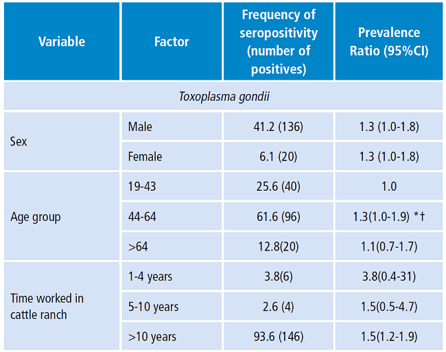 Serologic evidence indicates that toxoplasmosis is one of the most common human infections throughout the world. 23 In this study, sex, an older age, and the time worked with livestock herds proved to be related with seropositivity for IgG antibodies against the infections analyzed, more in men than in women, which may be strongly associated with the ratio of men to women studied (higher than 6:1; 136 against 20, respectively). Similar findings have been reported in populations dedicated to livestock farming since the frequency of T. gondii antibodies (39.41 and 35.96% by ELISA and IFAT, respectively) increases with age, exposure to different animals and type of farming management and purpose. 24,25