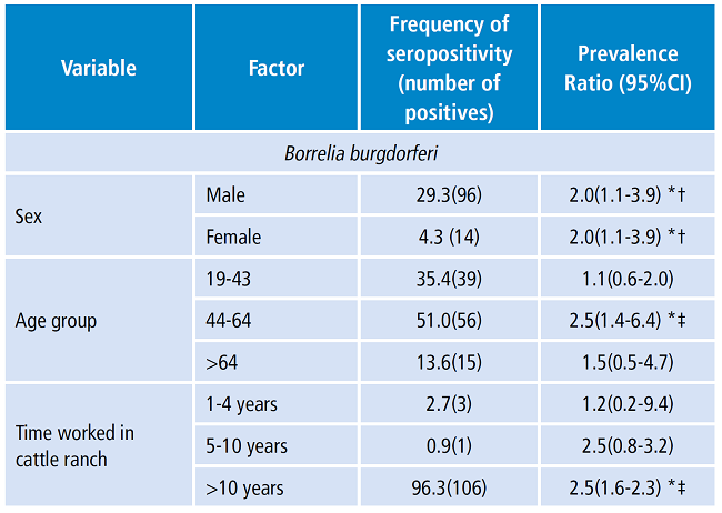 The frequency of both T. gondii and B. burgdorferi was statistically associated with sex, age group and time worked in cattle ranches, being higher in men than in women between 44 and 64 years of age with 30% (prevalence ratio 1.30) and 20% (prevalence ratio 2.0) respectively, and 50% (prevalence ratio 1.50 and 2.50 respectively) in farmers with more than 10 years of work experience (Table 2). Regarding the other factors analyzed, no statistical correlation was observed with the seropositivity detected in this study.