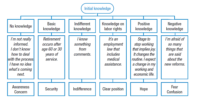 It was found that each type of initial knowledge was related to some specific feeling. For example, negative knowledge, accompanied by fear and confusion, was observed in well-informed people regarding the new reforms to pension systems. In contrast, not knowing anything, after reflecting upon it, allowed other workers to become aware of the upcoming change, but also to worry about their lack of knowledge. Likewise, security was observed in people who knew the basics (age and years worked), indifference in those who knew little, a clear position in those who knew about labor law, and hope in people with positive knowledge.
