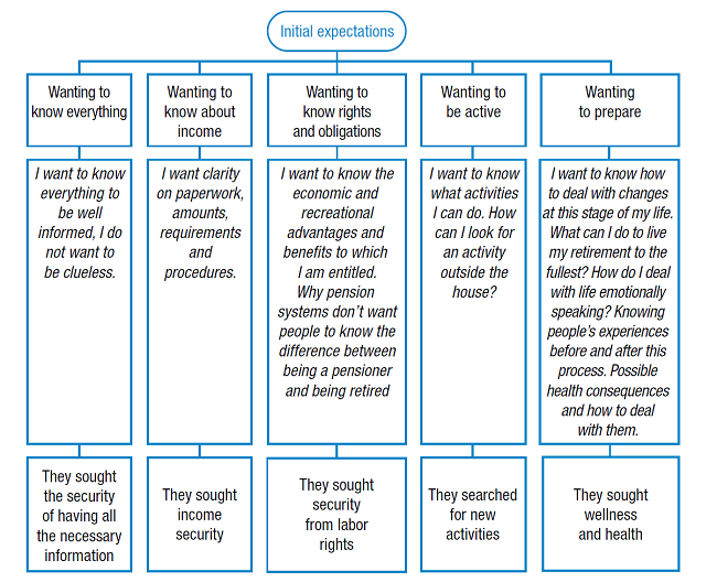 With respect to the initial expectations, some people wanted to know everything; they were the workers who had no knowledge, basic knowledge, indifferent knowledge and knowledge about labor rights. Other people wanted to know how to stay active (people without knowledge, basic knowledge and positive knowledge). What all workers did agree on was their interest in knowing about the processes, amounts, procedures and requirements for retirement, knowing their employment rights, and knowing how to prepare for retirement.
