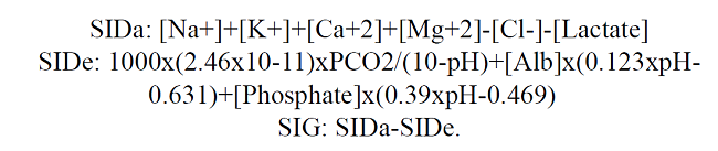 Arterial blood gases were processed in a blood gas analyzer AVL OMNITM 1-9 RADIOMETER. The same blood sample was used to measure sodium, potassium, chlorine, calcium and lactate in a Roche Cobas B 221 system using the direct selective ion method. Magnesium, phosphate and albumin were measured on a Roche/Hitachi Modular-P analyzer using a colorimetric method. The variables were calculated using the following formulas: