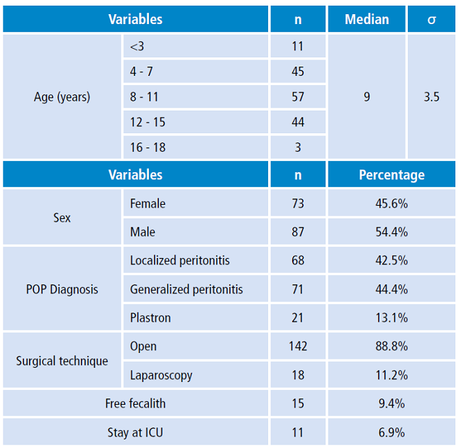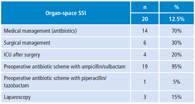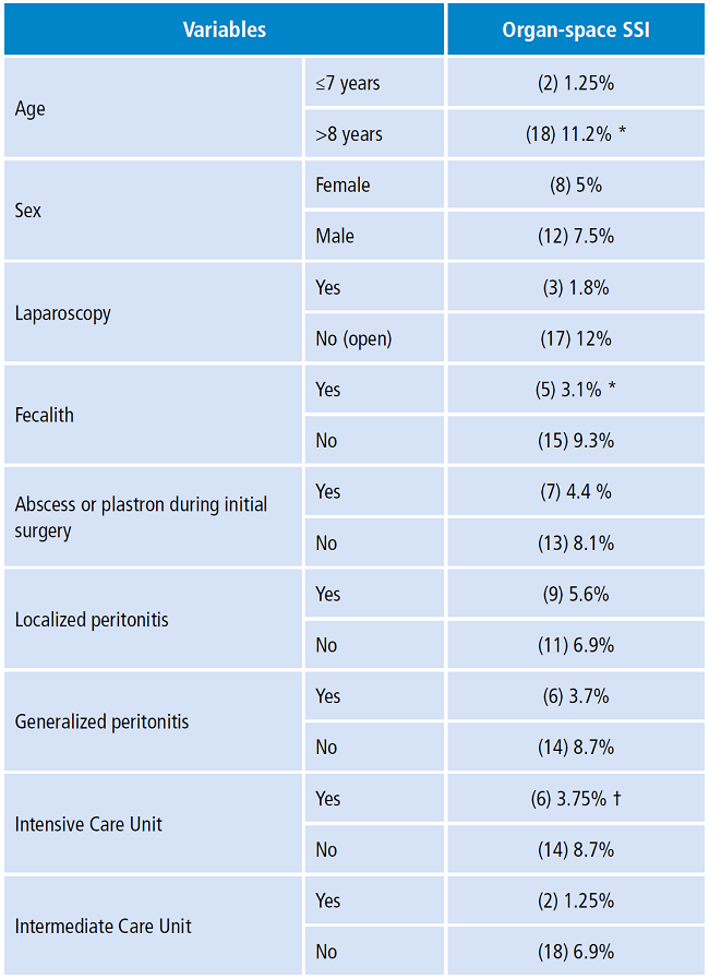 Results: 20 patients (12.5%) presented with OS-SSI and all of them received antibiotic treatment; 70% did not require abscess drainage. Patients ≥8 years of age had 5 times more abscesses than younger ones (17.6% vs. 3.4%). OS-SSI was found in 33% of patients with free fecalith and in 50% of the patients who required postoperative management at the ICU vs. 9.5% of the patients who received management in the intermediate care unit and the inpatient hospital floors. The total rate of surgical site infection was 24.3% (11.8% superficial, 0% deep and 12.5% organ-space).