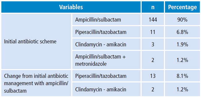 Initial post-operative antibiotic management included ampicillin/ sulbactam in 144 patients (90%); piperacillin/tazobactam in 11 patients (6.8%), which were taken to the ICU right after surgery; clindamycin and amikacin in 3 patients; and ampicillin/sulbactam and metronidazole in 2 patients (Table 2). The treatment of 13 of the children treated with ampicillin/sulbactam in the post-operative period was switched to piperacillin/tazobactam after OS-SSI diagnosis, and to clindamycin and amikacin in 2 patients due to an allergic reaction (Table 2).