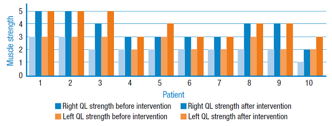 Strength of the quadratus lumborum muscle increased two points in the rating of 50% of the study population; the other half had an increase of one point. It should be noted that the affected side had a lower level of muscle strength in all patients (Figure 1).