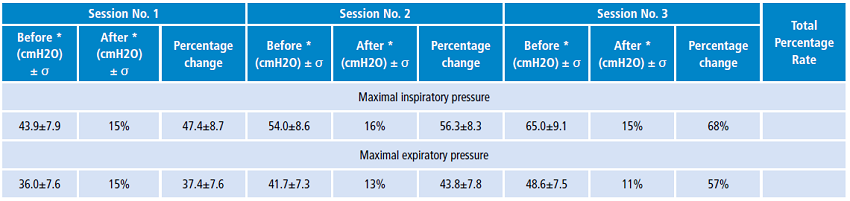 Results: The average MIP was 41% of the reference value at the beginning of the intervention, which increased to 69% at the end of the sessions. On the other hand, the initial average MEP was 33%, while the post-intervention average MEP was 51%. The average change rate for MIP was 68% and 57% for MEP. The Wilcoxon signed-rank test was performed, achieving a statistically significant difference (z=-2.807, p=0.005).