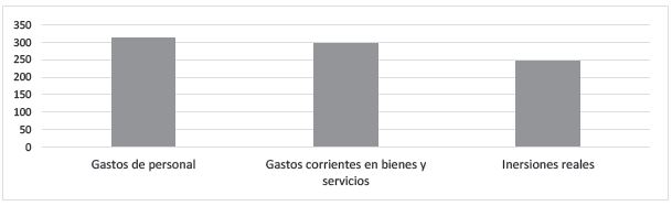 Si nos detenemos en los capítulos según su repercusión sobre el total de gastos soportados, los tres más importantes, que suponen el 88 % del total, fueron el de gastos de personal, comprensivo de todo tipo de retribuciones e indemnizaciones por razón del trabajo así como de las cotizaciones obligatorias, que se llevó el 32,33 % del total; el de gastos corrientes en bienes y servicios, que recoge los gastos necesarios para el ejercicio de las actividades que no originen aumento de capital o de patrimonio público, así como los gastos en bienes de carácter inmaterial que puedan tener carácter reiterativo, no sean susceptibles de amortización y no estén directamente relacionados con la realización de las inversiones, que supuso el 30,57 % de la factura; y el de inversiones reales, comprensivo de los gastos destinados a la creación o adquisición de bienes de capital así como los destinados a la adquisición de bienes de naturaleza inventariable necesarios para el funcionamiento operativo de los servicios y aquellos otros de naturaleza inmaterial que tengan carácter amortizable, suponiendo el 25,39 % del total.