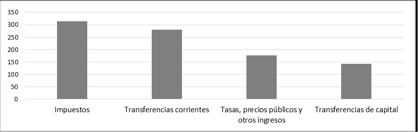 Son 5 los Capítulos más importantes de ingresos, que suponen el 89,7 % del total, aunque a efectos de este estudio los agruparé en 4, unificando en uno el referido a impuestos.