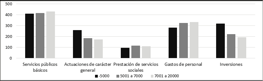 De lo anterior se concluye que a menor población mayores gastos de organización y funcionamiento, y por tanto improductivos, y menor atención a los propios servicios. Así a la prestación de servicios públicos básicos destinan 2,5 puntos menos que los Ayuntamientos de entre 1.001 y 5.000 habitantes pero hasta 6 puntos menos que los que están entre 5.001 y 20.000, así como 3,5 puntos menos en servicios sociales que los de 1.001 a 5.000 y 27 menos con respecto a los de 5.001 a 20.000, y todo ello a cambio de destinar 6 puntos más en gastos generales que los de entre 1.001 a 5.000 y hasta el doble de los que están entre 5.001 y 20.000 habitantes.