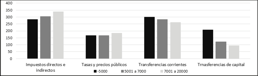 Del estudio comparativo general de ingresos se desprende que cuanto menor es el Ayuntamiento menor es también su capacidad recaudatoria. Así en el capítulo de impuestos los municipios de entre 5.000 y 7.000 habitantes recaudan en términos per cápita un 7,2 % más que los que tienen menos de 5.000, sobre todo por impuestos directos, donde el diferencial está en el 8,5 %. Sin embargo la recaudación por tasas y precios públicos es muy similar, mientras que la dependencia de los ingresos provenientes del resto de Administraciones públicas a través de las transferencias tanto corrientes como de capital es mayor, y por tanto con menor autonomía municipal por falta de suficiencia financiera, de los municipios según disminuye su población. Y ello a pesar de que en el tramo de entre 5.000 y 7.000 habitantes el conjunto de estas transferencias suponen el 41,6 % del total de sus ingresos, pero es que en los que tienen menos de 5.000 sube hasta el 48 % (6,4 puntos porcentuales más).