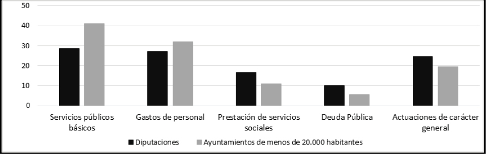 Si nos fijamos en las áreas de gasto resulta que lo destinado a la prestación de servicios públicos básicos por las Diputaciones es tan sólo el 17 % de lo que hicieron los Ayuntamientos de menos de 20.000 habitantes, y si nos fijamos en su peso específico sobre el total de gastos, en el caso de las Diputaciones supusieron el 28,5 % mientras que en los Ayuntamientos fue del 41 %, es decir, hay un diferencial a favor de estos últimos de 12,5 puntos, sin embargo sí hay una mayor prestación de servicios sociales por parte de las Diputaciones que por parte de los Ayuntamientos, así en aquellas supusieron el 16,5 % del total de sus gastos mientras que en estos se quedaron en el 11 %. Por su parte, al pago de deuda pública las Corporaciones provinciales destinaron casi el 10 % de sus gastos mientras que los Ayuntamientos de menos de 20.000 habitantes destinaron el 5,5 %, es decir, casi la mitad. En los gastos de personal la cuestión se invierte, lógicamente ya que son muchos más los Ayuntamientos que las Diputaciones, siendo el resultado en favor de estas, que dedicaron el 27 % del total, de 5 puntos porcentuales menos con respecto a aquellos, que destinaron el 32 %.