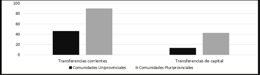 De los datos resultantes de las liquidaciones presupuestarias de las Comunidades Autónomas, publicadas en la web del Ministerio de Hacienda y Función Pública durante el período estudiado lo primero que debe acreditarse es si efectivamente las Comunidades uniprovinciales suplen en la práctica a las Diputaciones. Pues bien, si nos fijamos en las transferencias efectuadas a sus entidades locales veremos que, en términos per cápita, las de las uniprovinciales están muy lejos de las realizadas por las pluriprovinciales. De hecho en estas suponen una media de 132 euros por habitante frente a los 59 de las uniprovinciales, es decir, éstas están un 44,7 % por debajo de aquellas, cuando parecería que debería ser al revés al tener que incluir en sus presupuestos las que se supone que deberían ser en lugar de las que en las otras Comunidades realizan las Diputaciones. Si descendemos al detalle de estas transferencias vemos que las que realmente indican el compromiso de las Comunidades con la financiación de sus municipios, que son las corrientes, por tanto no finalistas y destinadas a los gastos de funcionamiento y prestación de servicios propios, estas ascienden en las uniprovinciales a 46 euros por habitante frente a los 89,5 de las pluriprovinciales. Y si ponemos el acento en las de capital, por tanto finalistas y que van más a favor de las inversiones y desarrollo de sus entidades locales, aquí la cosa empeora ya que las Comunidades uniprovinciales destinan 13 euros per cápita frente a los 42,5 de las pluriprovinciales.