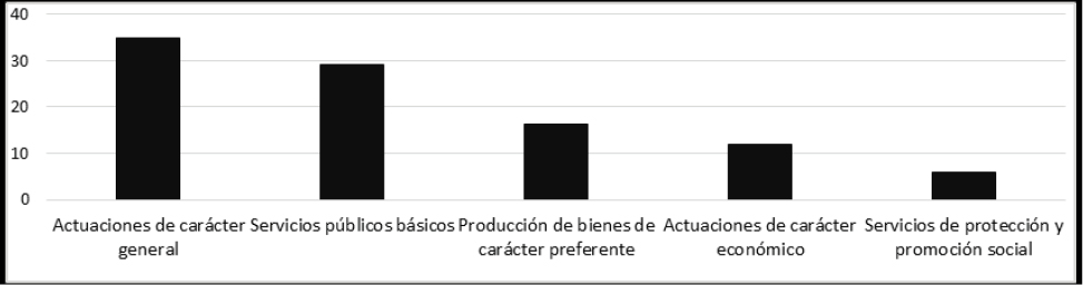 Lo primero que habría que determinar es si el comportamiento de las Diputaciones ha sido ajustado al papel que legalmente les corresponde. Así, si acoplamos sus competencias a las áreas de gasto que componen la estructura de los presupuestos de las entidades locales comprobamos que la inmensa mayoría de ellas se encuadran dentro de los denominados «servicios públicos básicos». ¿Pero será esta el área de gasto principal en la actuación de las Diputaciones?, pues parece que sí, junto a las actuaciones de carácter económico, sobre todo en lo referente a gastos en infraestructuras, situándose en torno al 30 % del total en cada caso, seguidas de las actuaciones de carácter general que suponen el 20 %, mientras que a servicios sociales dedican el 16,5 %.