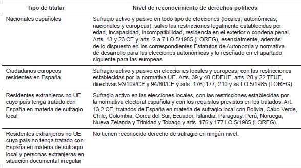 Partiendo del marco constitucional descrito, y del desarrollo convencional del reconocimiento del derecho de sufragio local de los residentes extranjeros que es objeto de este artículo, concluimos el apartado con este cuadro-resumen sobre el panorama de la titularidad de los derechos políticos de democracia representativa en España: