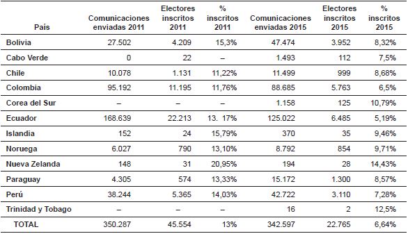 • Por último, pero no menos importante por su impacto práctico, está la cuestión del voto rogado. Como ya hemos descrito, el procedimiento del ejercicio del derecho de sufragio local de los residentes extranjeros que lo tienen reconocido implica el envío por parte del Gobierno español de unas comunicaciones a aquellas personas de este colectivo que conste que cumplan los requisitos exigidos por los respectivos tratados (nacionalidad, residencia legal, plazo mínimo de residencia…), para que posteriormente procedan a darse de alta en el CERE. El nivel de participación electoral real en este ámbito se puede medir comparando el número de comunicaciones enviadas y los electores efectivamente inscritos. En la siguiente tabla vemos los datos referentes a los comicios municipales de 2011 y 201528: