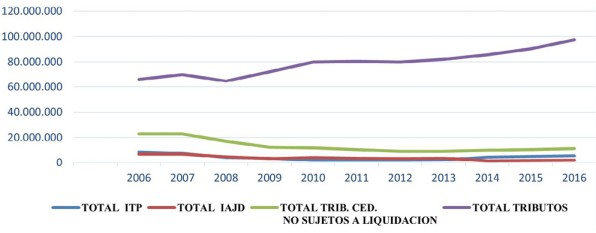 Por tanto, se puede considerar que en el periodo posterior a la crisis, la importancia recaudatoria de los tributos cedidos no sujetos a liquidación y más específicamente el ITPAJD ha sido mínima, en comparación con la obtenida por los impuestos sujetos a liquidación. Así en 2006, el ITPAJD constituía el 22,79 % del total de la recaudación por tributos, mientras que en 2016 se comprueba como el ITPAJD constituye solamente un 7,60 % de la recaudación tributaria total conseguida por las CC.AA de régimen común.