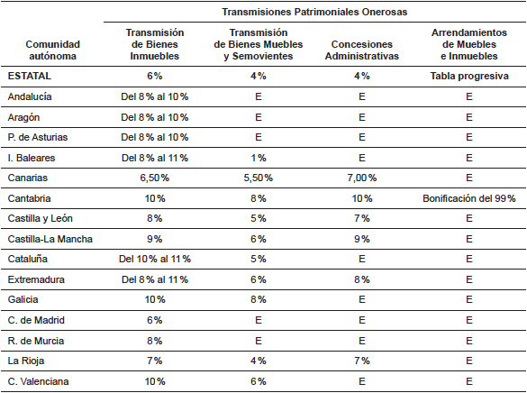 En la tabla 1, se refleja, como ejemplo de ello, los distintos tipos de la modalidad de Transmisiones Patrimoniales que las Comunidades están aplicando en el 2019, según el objeto del bien o derecho a transmitir. Como se puede observar, existen notables diferencias entre las distintas Comunidades con respecto a los tipos impositivos que cada una de ellas aplica para los casos que se muestran en la tabla. Los tipos impositivos que más varían entre las Comunidades son los que se aplican a la transmisión de bienes inmuebles (así como en la constitución y cesión de derechos reales sobre los mismos, excepto los de garantía), que oscilan entre el 6 % y el 11 %. Por ejemplo, mientras que la Comunidad de Madrid mantiene el tipo de gravamen que coincide con el de regulación estatal (6 %), las Comunidades de Andalucía, Aragón, Principado de Asturias, Islas Baleares, Cataluña y Extremadura aplican un tipo de gravamen progresivo en función del valor del inmueble, utilizando diferentes tramos. Canarias, Cantabria, Castilla y León, Castilla-La Mancha, Galicia, Región de Murcia, La Rioja y C. Valenciana han fijado tipos proporcionales superiores al 6 % que establece la normativa estatal.