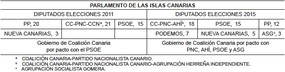 En Canarias, el partido Coalición Canaria permanece en el gobierno todos los años analizados, mediante pactos con el PSOE y diferentes partidos. Es en esta Comunidad donde se mantiene el tipo más reducido de todas las CC.AA (6,5 %) a excepción de la Comunidad de Madrid (6 %).