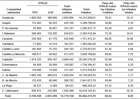 La recaudación del ITPAJD en el conjunto de CC.AA tiene un gran peso sobre la recaudación de los tributos cedidos, constituyendo un 64,55 % del total de dicha recaudación, en el año 2017. Este alto porcentaje tiene su principal protagonista en la modalidad de TPO, la cual supone casi la mitad de la recaudación de los Impuestos Cedidos. Sin embargo, su importancia sobre la recaudación tributaria total es bastante más modesta, representando solo el 8,59 % de la recaudación total.