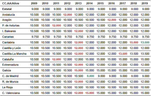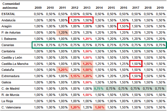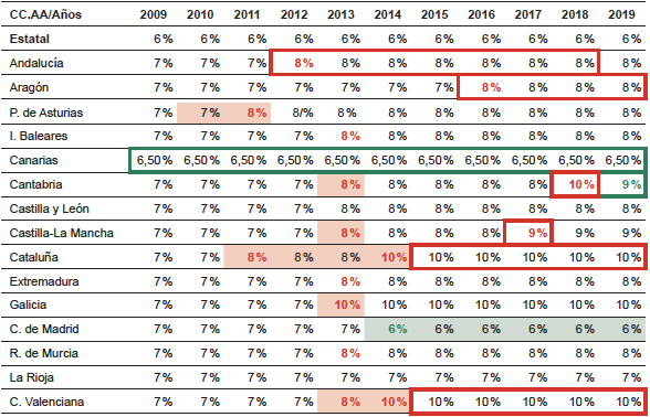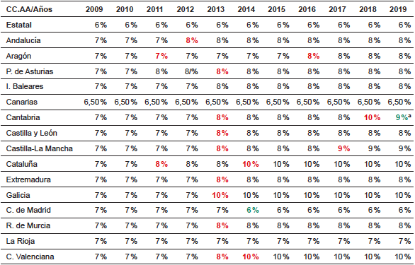 En los siguientes años, los tipos impositivos van sufriendo algunas modificaciones, llegando así al año 2019 en el que ninguna Comunidad Autónoma mantiene el 7 % del año 2009, salvo La Rioja, y con la peculiaridad de que la única Comunidad que incluso disminuye su tipo impositivo es la Comunidad de Madrid, estableciendo un 6 %.