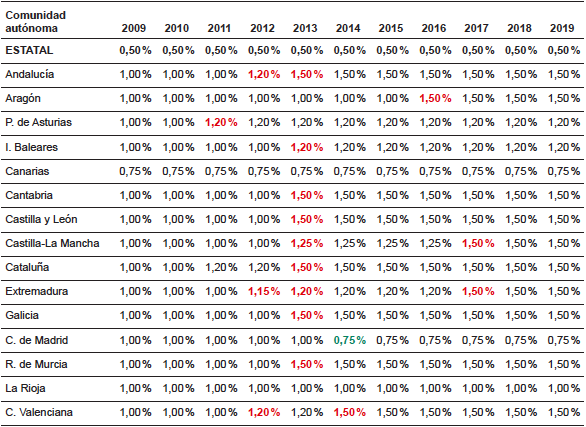 Las Comunidades de Islas Baleares, Castilla y León, Extremadura y Región de Murcia, con gobiernos del PP desde 2011, suben el impuesto del 7 % al 8 %, dos años después de su entrada en el gobierno (en 2013) manteniéndolo hasta la actualidad. Galicia gobernada por el PP con mayoría absoluta, al igual que las anteriores comunidades sube su impuesto al 10 % en el mismo año, manteniéndolo también hasta la actualidad. Esta subida de 2013 en Comunidades regidas por el PP se debieron tomar por la urgente necesidad de incrementar la recaudación que hasta ese momento había sido muy baja causada por la crisis y el estallido de la burbuja inmobiliaria, y teniendo en cuenta que ya en dicho año se tenían indicadores de una tímida recuperación.