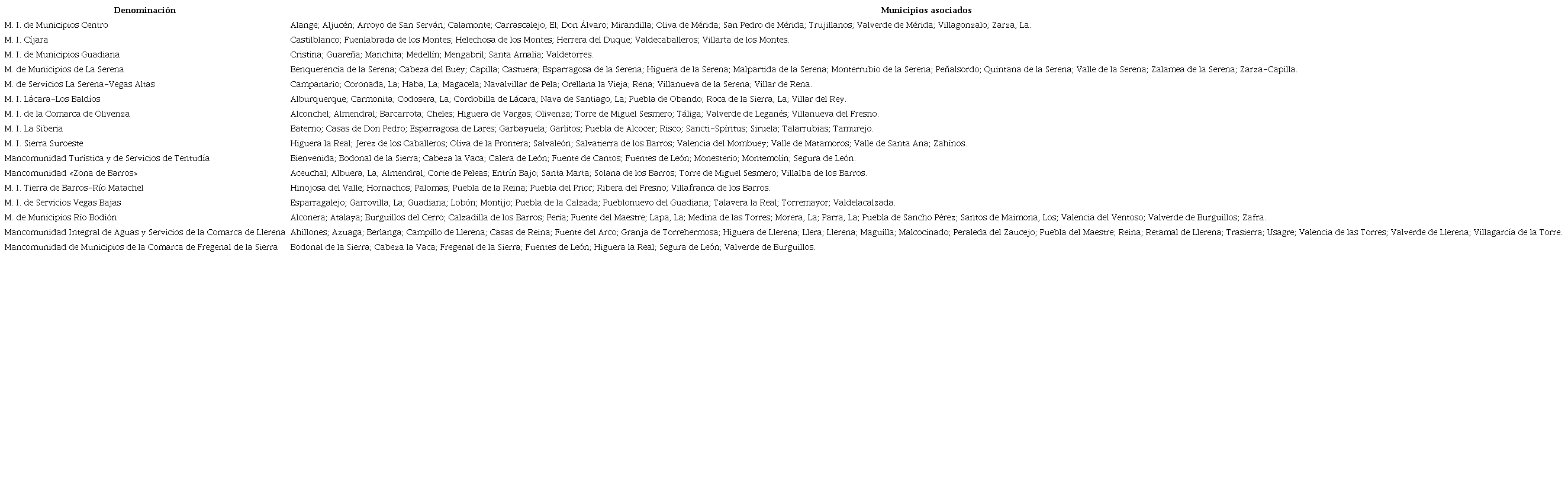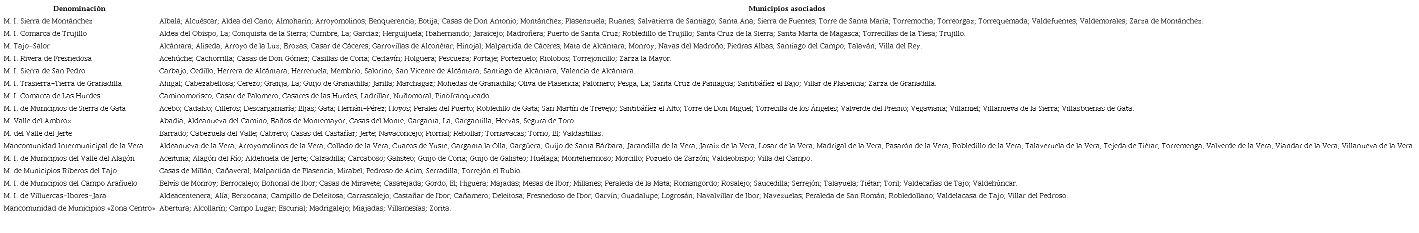 La excepción a esta regla la encontramos en las capitales de provincia (Badajoz y Cáceres), en la capital autonómica (Mérida) y en la ciudad de Plasencia. Son también excepción, pero sólo a razón de la calificación de «Integral», los Municipios de Don Benito y Villanueva de la Serena que tienen conformada su propia Mancomunidad de servicios en común pero donde no participan otros Municipios. Finalmente, son excepción a esta estrategia los Municipios de Navalmoral de la Mata15, Almaraz16 y Almendralejo17, teniendo en común el haber formado parte de una Mancomunidad Integral y, posteriormente, haber instando su salida del grupo de manera más o menos azarosa.