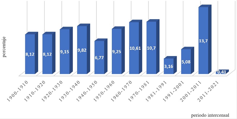 Si se analiza la evolución de la población en España desde 1900, se percibe un incremento sostenido en toda la secuencia 1900-2011, con la excepción de los periodos 1981-2001 en los que hubo un menor incremento de la población y, a partir de ese año 2011 un acusado descenso hasta tener un periodo intercensal 2011-2021 de un incremento poblacional de únicamente un porcentual del 0,41, debido fundamentalmente a la existencia de un emigración exterior que compensan el saldo vegetativo negativo que existe actualmente en España12.