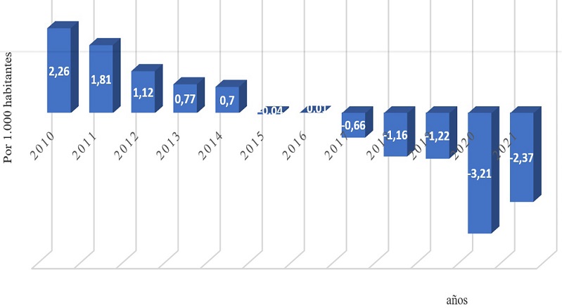 Si se estudia la evolución del saldo vegetativo en España (diferencia entre nacimientos y defunciones por mil habitantes), se puede comprobar como esta viene descendiendo de forma paulatina y constante desde el año 2011 al 2021, año este que se encuentra en un porcentual del –2,37.