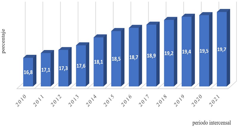 Por último, en lo que se refiere a la evolución de las personas con una edad superior a los 65 años, podemos advertir que en los últimos 10 años se ha pasado de un porcentual de 16,8 al 19,7.