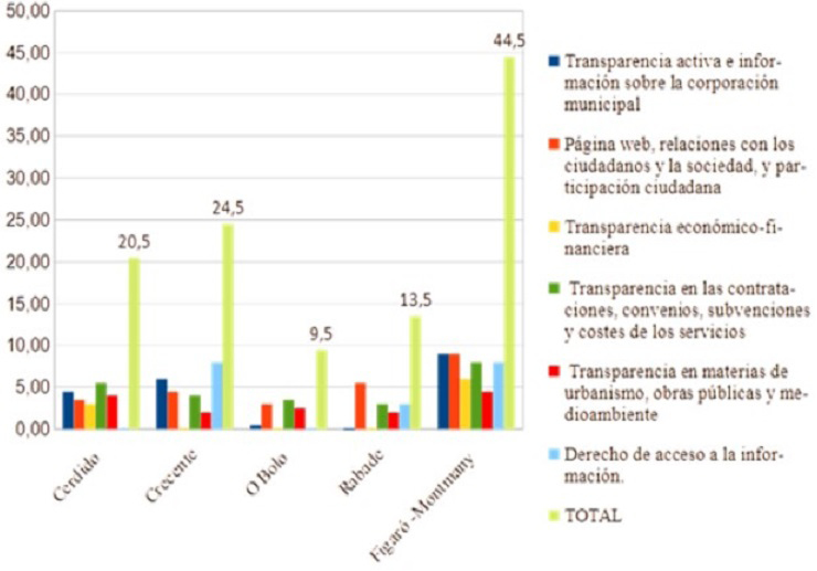 Tal y como se observa en el Gráfico 1, y después del análisis de los 80 Ítems de Transparencia Internacional se puede afirmar que existe una gran diferencia entre los ayuntamientos analizados, obteniendo toda una puntuación muy baja en comparación con el ayuntamiento referente.