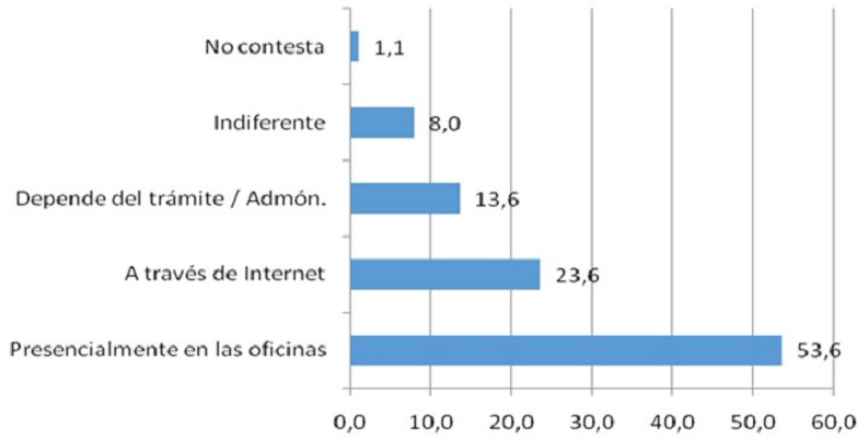 Los datos recogidos en este estudio estadístico del barómetro de febrero de 2022 de la empresa Sondaxe, S. L. demostraron que las personas prefieren realizar los trámites administrativos presencialmente con la administración.