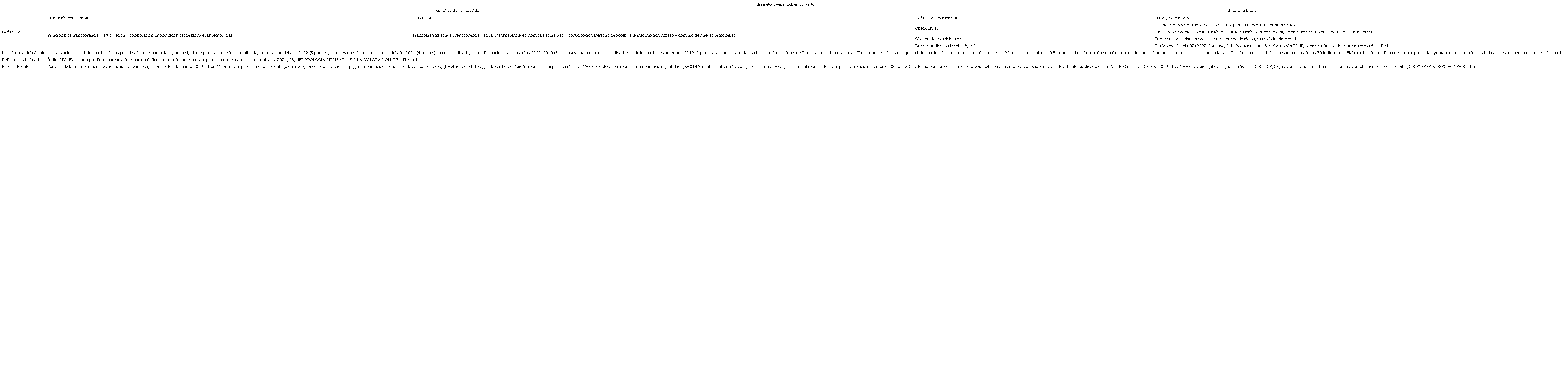 El necesario proceso de operacionalización de las variables nos obliga a utilizar una serie de técnicas de recogida de datos diferentes en función de la variable a analizar. En relación a la variable dependiente y para conocer el desarrollo de los principios de gobierno abierto se procedió al examen de experto heurístico de los portales de transparencia a través del check list de los criterios de Transparencia Internacional (TI) se procedió a intervenir en el proceso participativo de Figaró-Montmany para la instalación de semáforos con video vigilancia realizado en marzo de 2022 en la plataforma https://participa311-figaro.diba.cat/, para poder comprobar la facilidad de acceso y el contenido de la información. El proceso se continuó hasta la última etapa, sin emitir el voto final. También hubo un seguimiento de redes sociales como Facebook e Instagram de las unidades de investigación analizadas, terminando con una utilización de fuentes secundarias de información a través do informe y datos estadísticos sobre brecha digital en Galicia de febrero de 2022 realizada por el Instituto Sondaxe, S. L. Así mismo, se contactó por vía correo electrónico con los responsables de la Red de transparencia de la FEMP para que nos remitieran información sobre el número de ayuntamientos adheridos y posibles ejemplos de buenas prácticas.