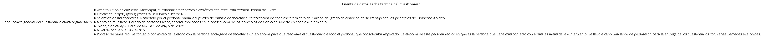 • Datos del cuestionario y entrevista del ayuntamiento de Figaró-Montmany. Los datos demuestran la existencia de un clima organizativo bueno, no alcanzando la puntuación media de 100 puntos. La confianza en el grupo, el entorno de trabajo y el liderazgo son los más valorados. Llama la atención, por un lado, la existencia de dos puestos de trabajo que precisan de titulación universitaria para llevar la parte administrativa y desarrollo de los principios de gobierno abierto, así como la puntuación del apartado de innovación que no se sitúa entre las mejores puntuaciones, siendo este el ayuntamiento referente en la materialización de los principios de gobierno abierto.