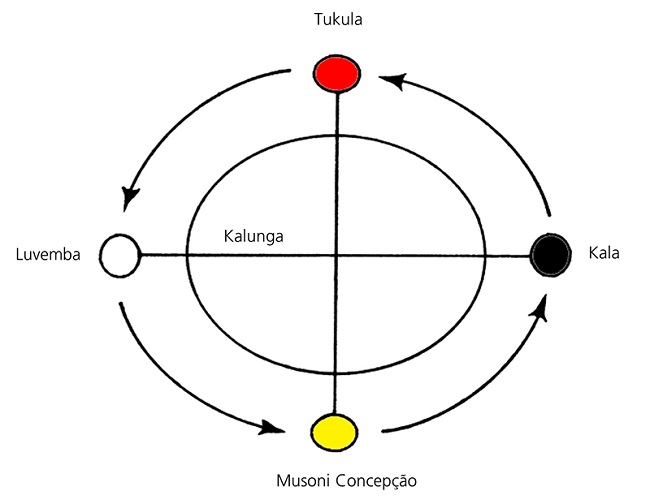 Tudo isso está expresso no cosmograma congolês (Figura 1), em que Musoni se refere à concepção e surgimento da vida, Kala se refere ao nascimento, Kula, ao amadurecimento e apogeu da vida e Luvemba, à morte. A Kalunga separa os dois mundos, que podiam se comunicar com o auxílio de um sacerdote e com a mediação dos ancestrais. Mostrando o nascer e pôr do sol e mediado pela linha Kalunga, esse cosmograma falava também do ciclo da vida e fazia da cruz um símbolo já utilizado em rituais, em que o mundo natural e sobrenatural se entrelaçavam.