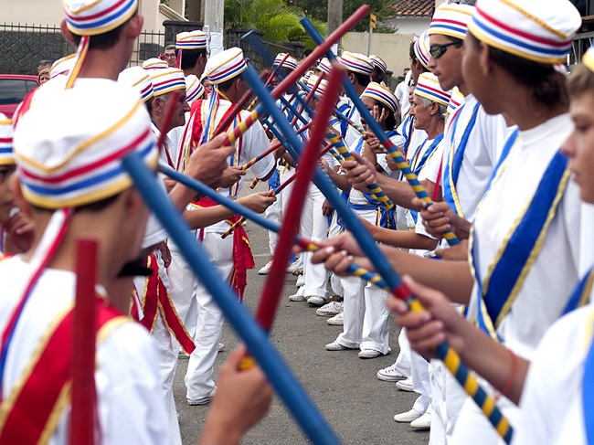 O Moçambique de São Paulo tem algumas peculiaridades interessantes. Ele é chamado por pesquisadores da cultura popular de Moçambique autônomo ou moçambique de bastão. Os dois nomes derivam da forma como ele sai às ruas. Autônomo, porque, diferentemente do primo mineiro, que em geral sai nas procissões acompanhando a guarda de Congo17, o Moçambique paulista caminha desvinculado dessa organização. Bastão, porque sua passagem pelas ruas se faz com a encenação de um tipo de batalha com bastões que, de certa forma, lembra o auto dos Maculelês18. Somado ao fato de que alguns grupos se dividem em azuis e vermelhos, a disputa com bastões remete ainda ao auto das Cavalhadas e Cheganças, com a encenação da luta entre Cristãos e Mouros (Foto 14).