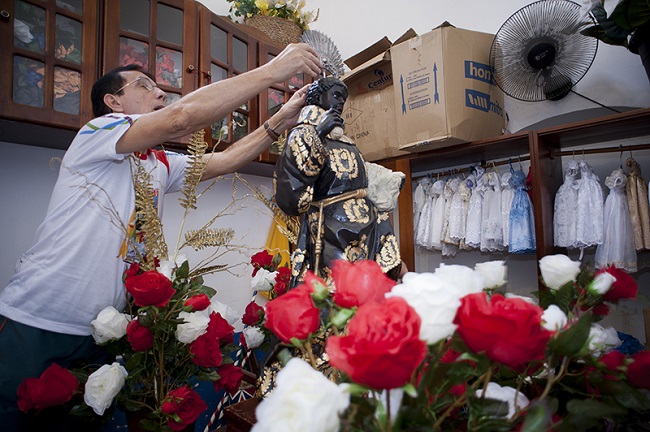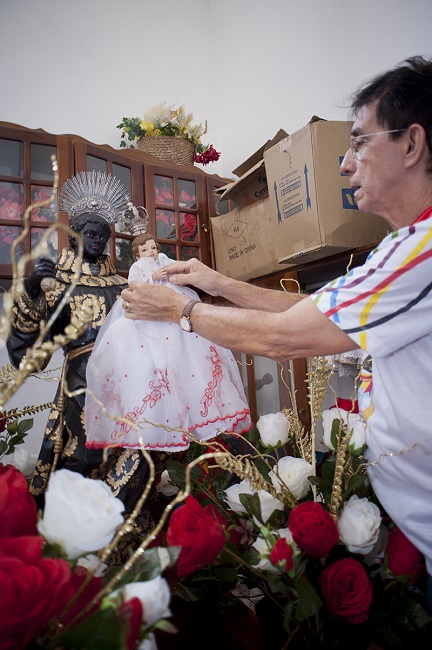 As Fotos 2 e 3 foram feitas em Bragança (PA), na festa de São Benedito, e mostram a preparação do andor do santo homenageado. O homem fixa o esplendor na cabeça de São Benedito, sinal de sua santidade. No fundo da foto, pode-se ver um cabide com vários pequenos trajes. Eles são parte de uma outra devoção que corre paralela à homenagem ao santo negro. São doações para vestir o menino Jesus que vai nos braços de São Benedito e, a cada ano, alguém da comunidade de Bragança se dispõe a, no cumprimento de uma promessa, doar a roupa nova para o pequeno Jesus.
