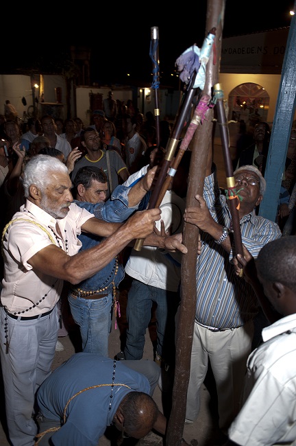 Assim, ainda que não se possa afirmar categoricamente que é isso que significa o levantamento do mastro em todas as festas de congadas, é possível apreender e relacionar essa cerimônia com suas origens africanas, pois o início da festa é também o início de uma caminhada. Além disso, o bastão utilizado pelos homens, que são capitães de guardas9 de Moçambique, também são semelhantes aos que representavam a autoridade de alguns sacerdotes do Congo, quando os portugueses por lá chegaram em 1483. O papel desse capitães, que conduzem as guardas nas procissões missionárias10 durante a festa, tem aqui uma semelhança com o das lideranças míticas daqueles sacerdotes, explicitadas pelo uso dos bastões.