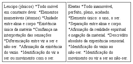 Abstract: The subject of this article is the antagonism among two philosophical “schools” developed from opposites principles: the ionian and italic “schools”. The former developed since Thales, passing through Anaximander, Anaximenes, Heraclitus, Leucippus, Democritus, Epicurus... wich philosophy is called materialist. The second, from Parmenides, Zenon... till mainly Socrates, Plato and Aristotle, wich is called idealist. The proposal is a scheme rereading of this history and a minimun questioning of its consequences. Since the Antiquity it can be seeing that the philosophers used to reconize the existence of that antagonism and wittingly used to battle among themselves, and as the history tells, the victorious were the idealists. It is not a exaustiv study about each one of those philosophers but only a few, those that I consider the most exemplary in the beggining of the greek phillosphy. It is considered yet how this antagonism has been negligected by the manuals of philosophy history. As the only way to show it is through the texts and testimonials themselves of the philosopheres thinking, the lector will find with greater emphasis an analysis of the atomism development by Leucippus from Anaximenes philosophy, in the opposite way of the usual assertion according to wich atomism has been arised from Parmenides doctrine of the Being.