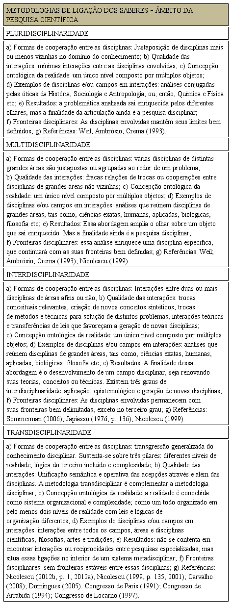 Contudo, em contraposição a esse paradigma da fragmentação, a partir de meados dos anos 50, começam a ser organizados vários esforços pela comunidade acadêmica para interligar os conhecimentos e investigar problemas cada vez mais complexos que surgiam. Pouco tempo depois, começaram a ser definidas várias nomenclaturas, com distintos prefixos, para especificar os diferentes tipos de metodologias de ligação dos saberes científicos que estavam sendo construídos. É importante ressaltar que essas distinções possuem, às vezes, caráter mais didático que metodológico. Segundo as explicitações de Nicolescu (1999, p. 54-55), a separação entre essas metodologias nem sempre é tão clara e o pesquisador assim esclarece: “A disciplinaridade, a pluridisciplinaridade, a interdisciplinaridade e a transdisciplinaridade são as quatro flexas de um único e mesmo arco: o do conhecimento”. Não se tem no presente trabalho a pretensão de estabelecer fronteiras inabaláveis entre essas distintas e, ao mesmo tempo, complementares abordagens.. Todavia, com o quadro a seguir pretende-se comparar as características de cada uma das citadas metodologias.