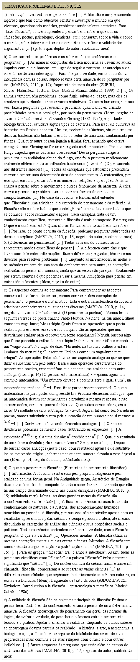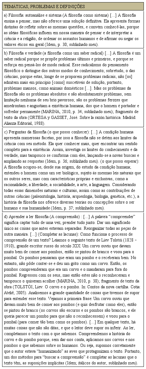 Ademais, Marina elucida que o próprio saber filosófico apresenta modos distintos de pensar os mesmos problemas. O autor do livro didático destaca ainda que as ideias filosóficas influenciam o modo como se pensa e interpreta a ciência e a religião (Quadro 3, a). Também, com o propósito de destacar mais uma característica da filosofia, ou seja, o seu caráter radical, Marina (2010) introduz um fragmento de texto de José Ortega y Gasset. Segundo esse filósofo a radicalidade filosófica consiste em pensar problemas últimos e primeiros sem limitação alguma. Destaca ainda que essa radicalidade filosófica consiste na principal diferença entre filosofia e ciências, pois essas não admitem mais os problemas radicais como passíveis de solução (Quadro 3; b).