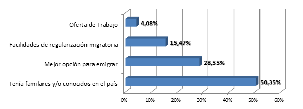Al considerarse los motivos que los llevaron a escoger el Perú como destino, el 50,35% manifestó tener en el país familiares y/o conocidos que ya residían acá; 28,55% consideraba que era la mejor opción para emigrar y 15,47% consideró que le era más fácil regularizar su condición migratoria.