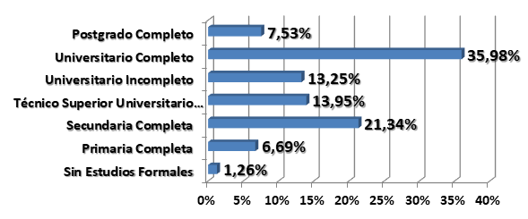 Al considerar los perfiles profesionales de la población inmigrante (véase la Tabla N°1) se pudo constatar que el 33,19% de los inmigrantes tenía estudios universitarios completos y 13,95% ostentaban títulos de Técnico Superior Universitario, a la vez que 7,53% tenía estudios de postgrados finalizados.