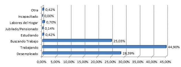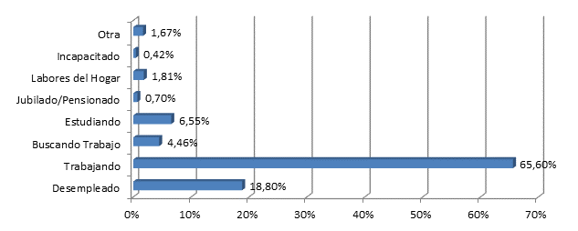 Respecto a su situación ocupacional al momento de la encuesta, el 44,90% dijo estar trabajando, frente a un 28,39% que dijo estar desempleado y un 25,03% que manifestó estar buscando trabajo. De los ocupados, 66,22% respondió estar ejerciendo cargos operativos; 12,77%, libre ejercicio profesional; 9,31%, dueños de su propio negocio e igual porcentaje cargos de supervisores. Respecto a la percepción del desempeño laboral como inmigrantes, el 75,30% señaló que consideran las condiciones de trabajo mucho más precarias para ellos.